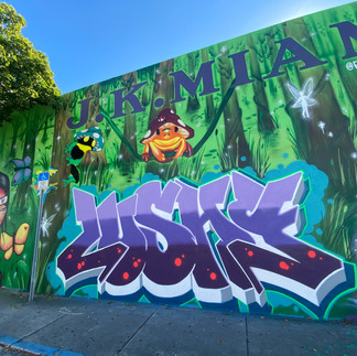 In December of 2021 the Few & Far Women crew came together to paint with friends and guest artists from around the world involving a total of 49 womxn + lgbtqia artists! This was the perfect way to celebrate their ten yer anniversary, during Miami Art Week 2021 in the Wynwood Arts District! Participants traveled from Japan, Colombia, California, Atlanta, New York, Virginia, Texas, etc. and of course plenty of local artists from Miami and South Florida. FNF has been painting on 28th & 5th in Wynwood together for the last four years, and in Wynwood for the last nine years. It started out with just one wall, and has since evolved to three large adjacent walls, and various other added spots on the block! We believe this to be the largest all-womxn mural production in the city, and likely the whole country! The theme this year was, “the Few & Fairy Forest” : an edgy fairy vibe dotted with a plethora of mushrooms, cute animals and swamp creatures. The various art styles melded traditional graffiti with progressive street art aesthetics, tied together by a green forested background. We are truly grateful for all of the amazing artists that contributed to this special production. Everyone worked together, uplifted each other, and developed new connections with other womxn. The Few and Far Crew Productions have become a staple in the Wynwood Arts District. Tour companies bring their guests by the wall daily, and you can usually catch someone using our walls as a back drop for photoshoots, music videos, and of course selfies! None of this is possible without your support!!! We are so grateful to our friends, family, sponsors, and those of you who donated to our gofundme! Thank you to Glayson of Galera Collective, Steph of Wynwood Mural Festival and all the folks at Museum of Graffiti!!! Thank you to LTC Power Rentals for providing us with three lifts! Thank you so much to Sunbelt Rentals for providing us with 5 of the biggest a-frame ladders I've ever seen! Thank you Liquid Death for providing the most delicious mountain water in a an aluminum can (better than plastic!)! Thank you XBTO Group for believing in us, thank you to Fashion Village and J K Miami Corp for giving us a space to paint, and finally thank you to 8.6 beer for keeping us stocked the whole weekend!!!